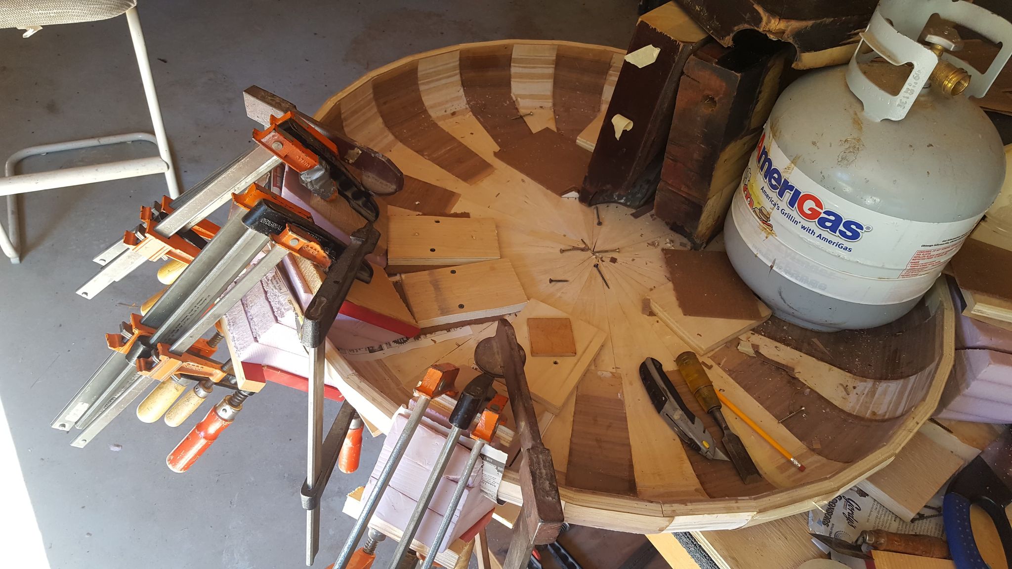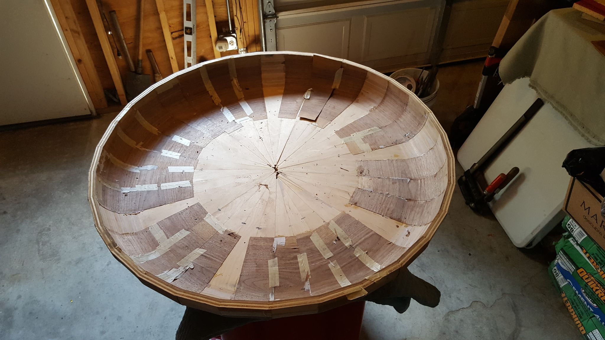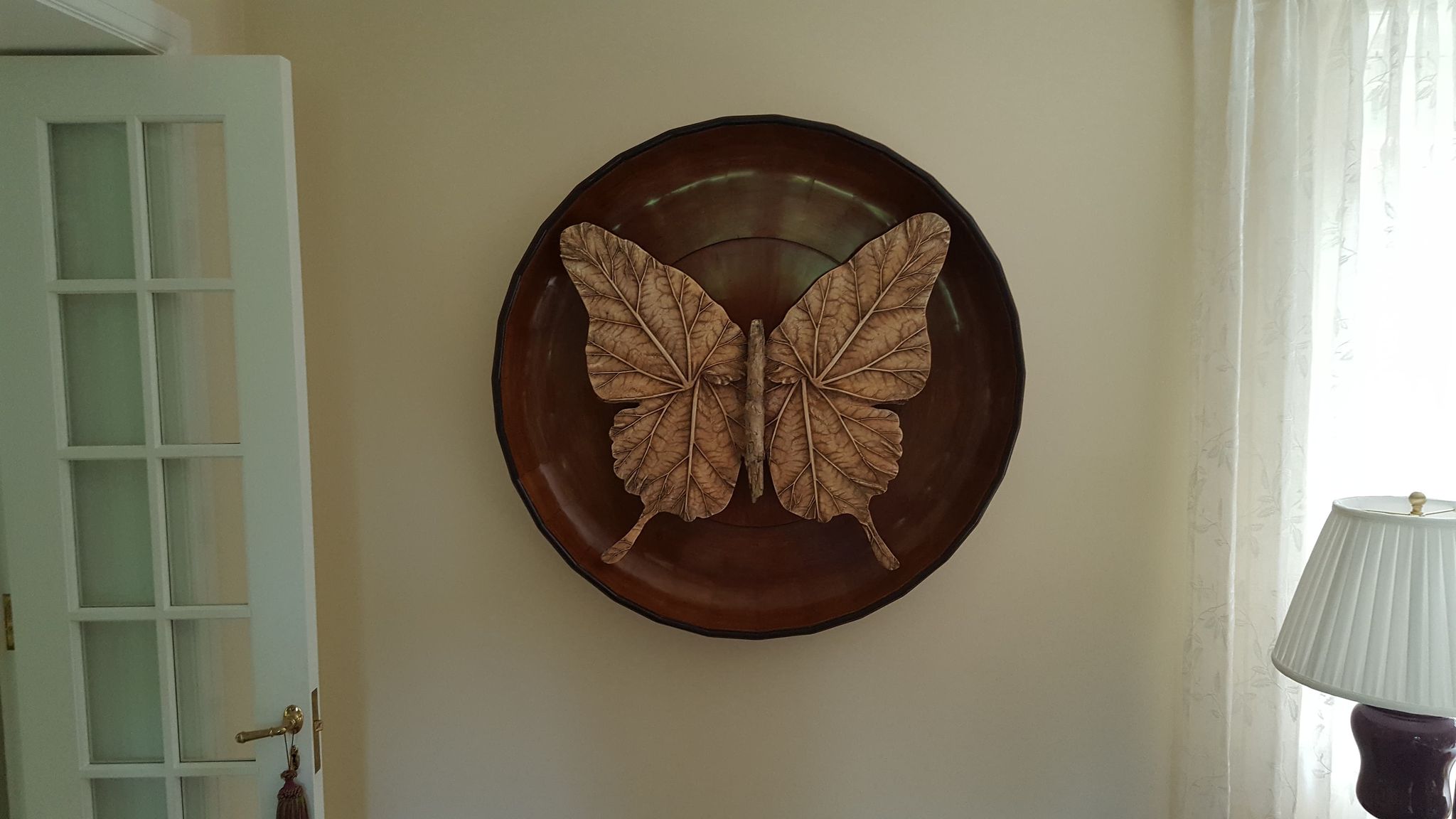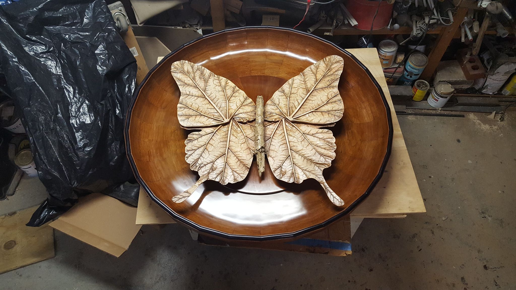 This wall-mounted decorative piece was made in collaboration with an artist. The plaster butterfly was made entirely by the artist, and the wooden frame was made by me. The frame is made out of maple wood, covered with a walnut veneer. The frame was assembled from individual triangular elements, which created a circle. Project number: 024 |